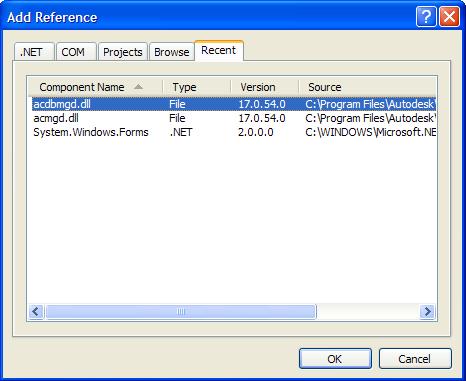 Before we look into the code, what has the Wizard done? It has created a Class Library project, adding a couple of references to the DLLs defining the managed API to AutoCAD. If you select "Add Reference" on the created project, you can see them in the "Recent" list: