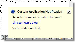 In this previous post I showed some code to display balloon notifications via InfoCenter in AutoCAD 2009 (and, it seems, in AutoCAD 2008, albeit with a different look & feel).