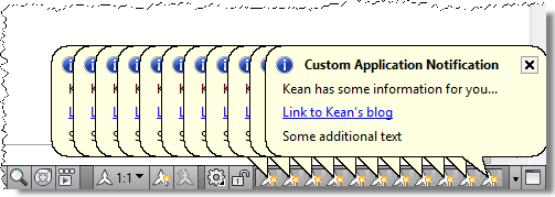 In a comment on that post, I promised to take a look at another way to show user notification balloons in AutoCAD, by displaying balloons (or maybe it's "blowing bubbles"? 🙂 on the application status bar. It's really up to you to decide which style of balloon is more appropriate for your application notifications... I personally find the InfoCenter balloons less intrusive (and more modern-looking), but the choice is yours. The duration during which the balloons are displayed is also controlled differently: the status bar "tray settings" controls the status bar balloons, the duration of the InfoCenter balloons is decided more directly by the application.