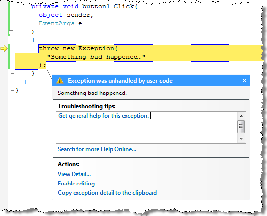 One thing to note: when running this from the debugger, Visual Studio will break, telling us that there's an exception that has gone unhandled: