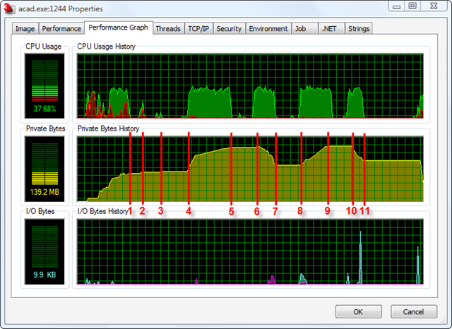 I fully admit to not being an expert when it comes to memory profiling - so I'm sure people will step in and tell me why what I've done isn't accurate - but this should give you a feel for the capabilities of this particular function. You can see that there is still some increase in memory usage, even after "destroying" the entities, but there is benefit to be derived here. With hindsight I probably shouldn't have referred to it as the "permanent object deletion" API, as UNDO and REDO still work fine: it simply means AutoCAD has to page the objects back into memory (which explains some of the memory increase: UNDO doesn't come for free as we need a buffer containing the changes to the objects).