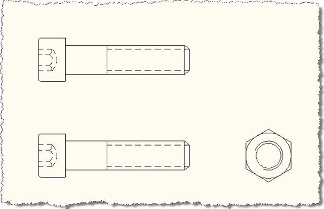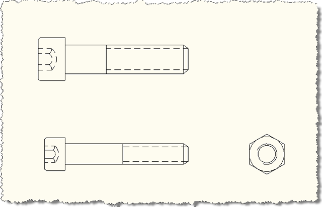 Let's see what happens when we put our ADBP command through its paces. Here's our initial state - we have two differently-sized instances of the same dynamic block, plus one instance of a different dynamic block (which shares parameters - the left-hand block is a "Hex Socket Bolt (Side)" while the right-hand block is a "Hex Nut" - both these blocks are available in the "Mechanical - Metric.dwg" sample file in the Samples\Dynamic Blocks folder of your AutoCAD installation).