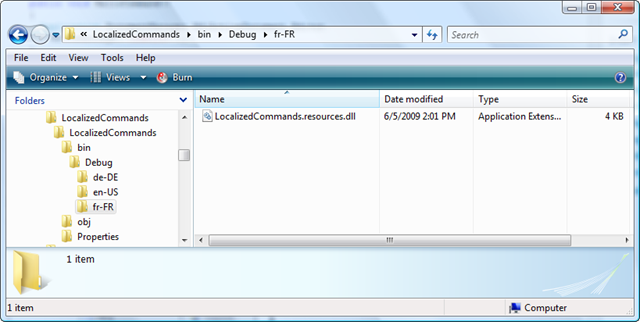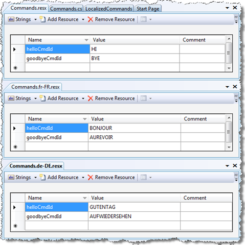 The localized command name is provided as a resource ID to aid localization. Let's see how this helps… we'll add some resources to the project for our neutral culture (US English) and for two additional cultures (French and German).
