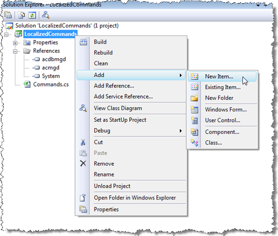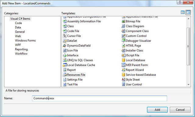 From here we can use the Add New Item dialog to add new resource files with the names "Commands.resx" (which is for the neutral culture, US English), "Commands.fr-FR.resx" and "Commands.de-DE.resx" (these three files will need to be added one-by-one). It's important that the resource files use the same base name as the .cs file (they do not have to use the class name – LocCmds – and, in fact, you may run into name collisions if you attempt to do so).