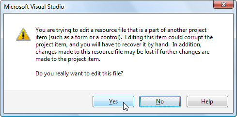 When we come to edit the individual string resources, we may be presented with a warning dialog (it is safe to select Yes):