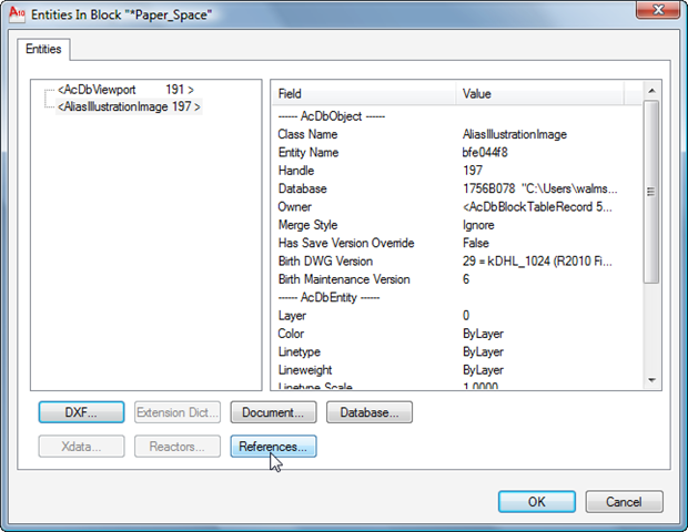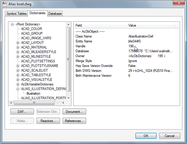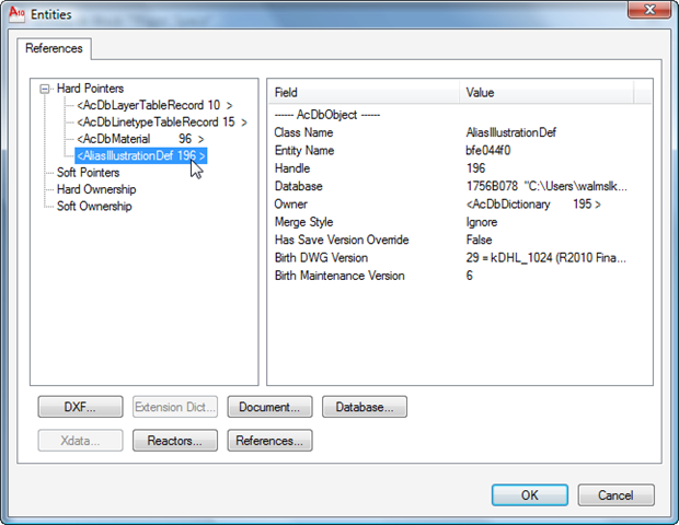 Looking at the AliasIllustrationImage object's references, we can see that it points to the standard entity property objects (Layer, Linetype, Material) as well as an AliasIllustrationDef object: