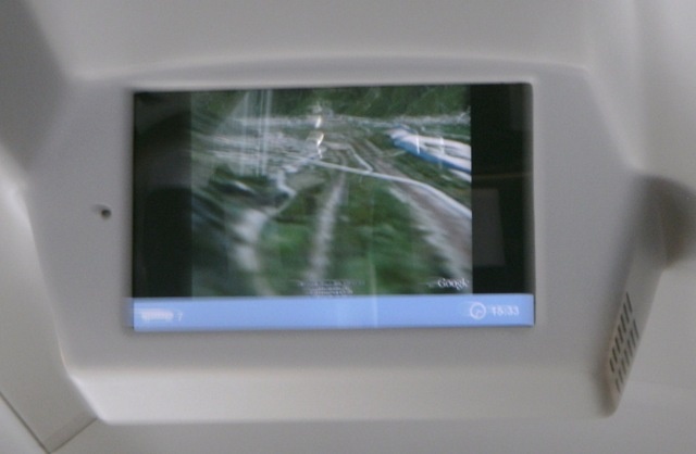 Aside from it being very comfortable – which is new, most of the other times I've made this journey have been in cattle-wagons – it's got one cool feature I hadn't seen before and simply had to mention: real-time tracking of our progress inside Google Earth displayed on overhead screens inside the cabin. Now you needn't even look out of the window to see where you are! Simply marvelous!
