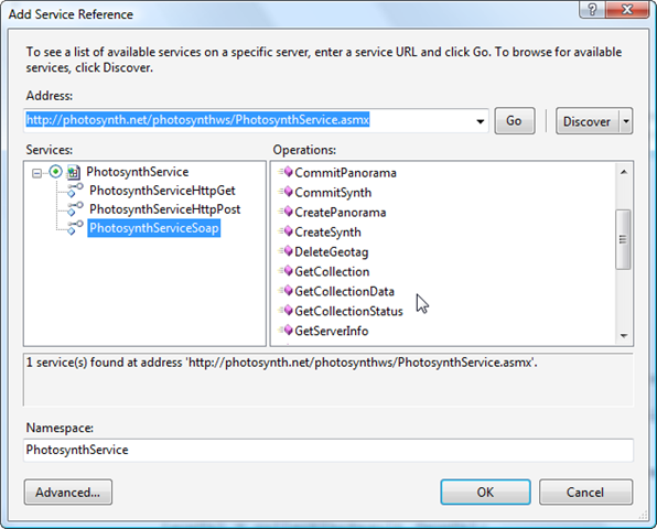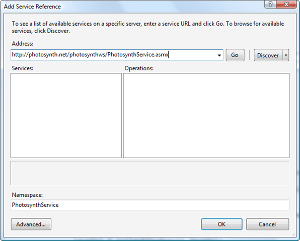 Adding service references to a C# project is easy – we right-click inside the Solution Explorer and select "Add Service Reference…", copying/pasting the web service URL (http://photosynth.net/photosynthws/PhotosynthService.asmx) into the Address bar: