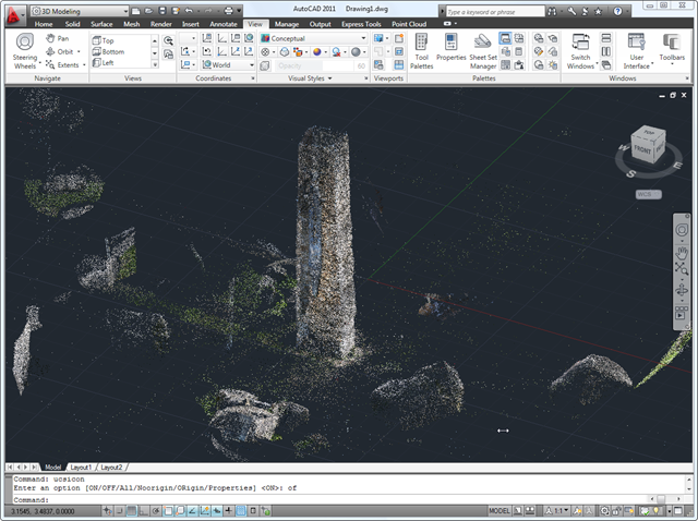 Here is the Photosynth's point cloud imported into AutoCAD 2011, which I brought in using the application in this previous post (which I expect to become a Plugin of the Month in October, all being well):