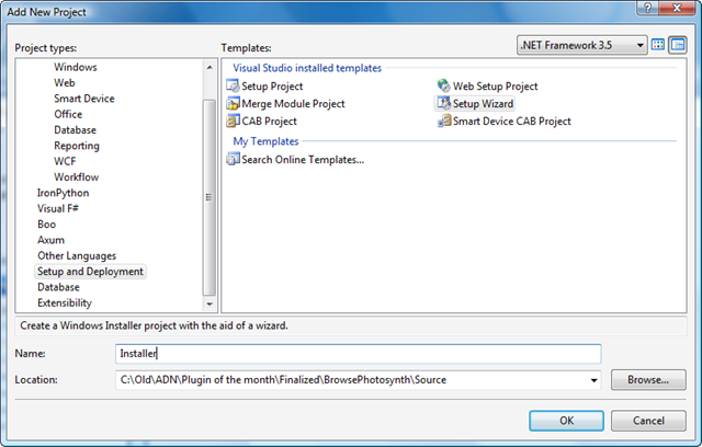Without further ado, let's start with our basic Visual Studio (in my case 2008) solution, and add in a custom Installer project: