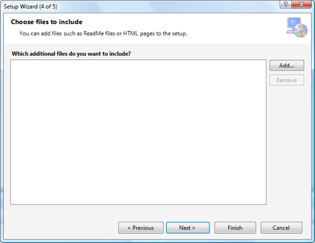We might add a simple Setup project, but the Setup Wizard will simplify a few steps for us: