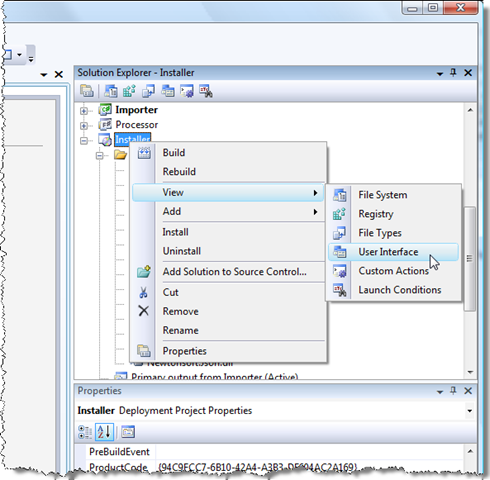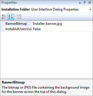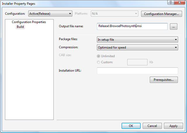 Let's get started with some fundamentals: the name of the MSI file itself. This can be modified via the Installer project's property page (which I pulled up by right-clicking the project in the Solution Explorer and selecting "Properties"):
