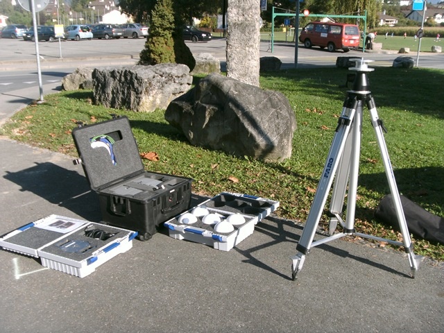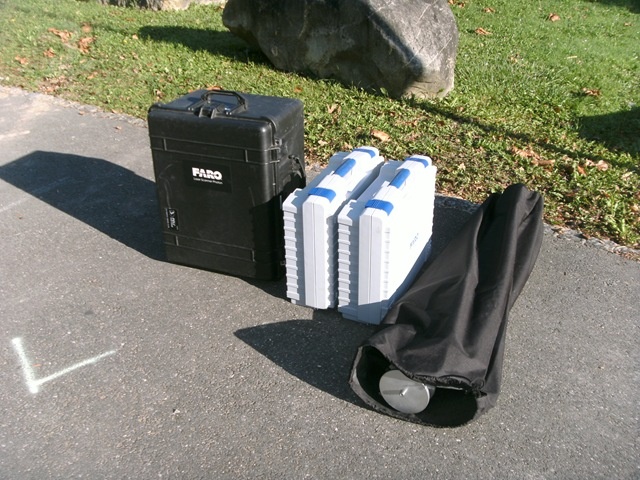As I wanted to take – and combine – a number of scans of the monument from different angles, I placed 5 reference balls such that (hopefully) 3 would be visible from each scan (see the white balls, below):