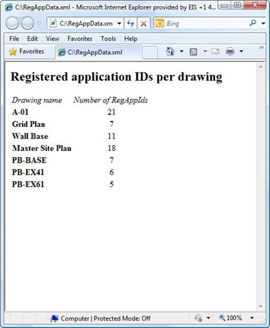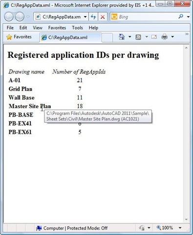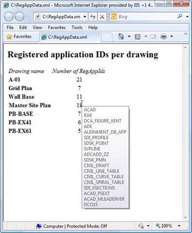 The stylesheet is also quite simple: it creates an HTML file containing a table of two columns – one with the names of our drawings (with the path and version in a tooltip) and the number of RegAppIds found in that drawing (with the specific names in a tooltip). We'll see that in action a bit.