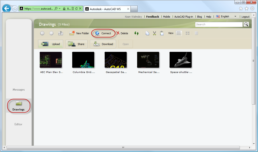 Once you've logged into AutoCAD WS you need to select "Drawings" in the left-sash and then the "Connect" button at the top: