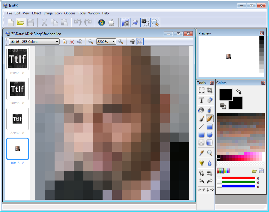 Here's what I ended up with, loaded in IcoFX. The base image was created from the blog banner with a simple image editor (I think I ended up using the one from the excellent SnagIt tool from TechSmith):