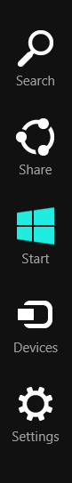 The three contracts I wanted to support are all accessible via the "Charms" menu in Windows 8: if you place the mouse cursor at the bottom right of the screen – or swipe left with your finger from the right-hand side of a touch-sensitive screen, although I have trouble getting this to work – then your Charms should appear (see the image to the right).