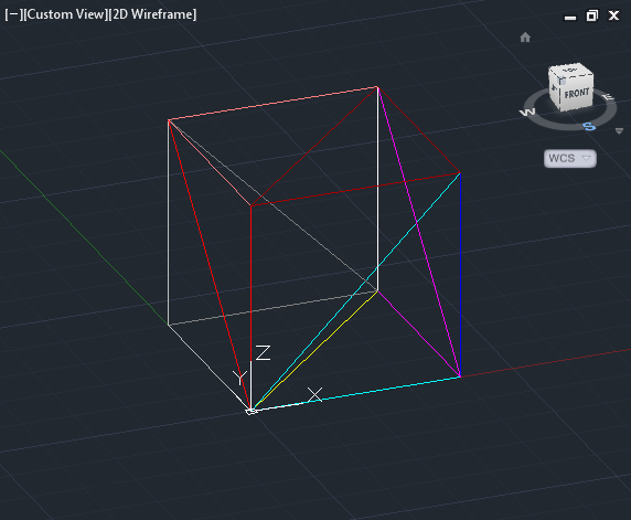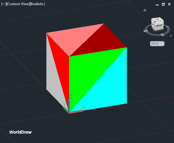 I originally defined the box's faces with four sides, but then decided to split them into three-sided polygons, instead (this is something that AutoCAD will do, in any case, and it allowed me to assign different colours within a single face of the cube), mainly for "debugging" purposes.