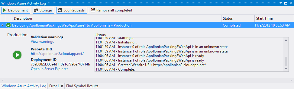 The actual deployment process can take some time (~5 minutes or so), at which point we should see a "completed" message inside Visual Studio: