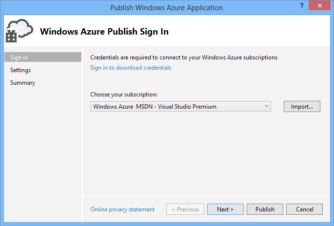 We need to sign in to MSDN in order to get our credentials – these get downloaded to your local system in a .publish file – and after selecting "Next" we can add a new cloud service in our preferred location, as well as choosing whether to post to staging or production (we'll be lazy and go straight to production) and specifying remote desktop settings in case we want to connect to the VM instance hosting our role (sometimes needed in case of debugging).