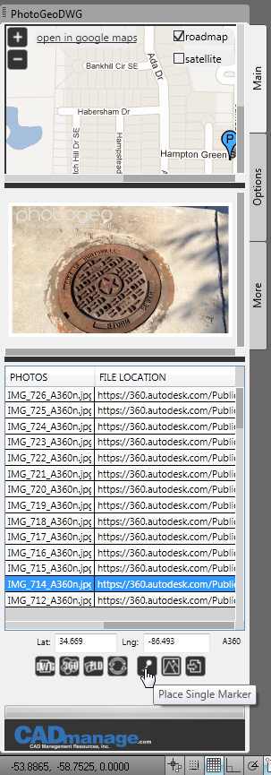 You can use it to locate the real-world condition in Google Maps that you'd like to document photographically, select the image you wish to use to do so – whether on the local system or up in Autodesk 360 – and then place a marker inside the current drawing. This marker connects back to your raster-based documentation (which you can also choose to insert directly into the DWG, should that make sense).