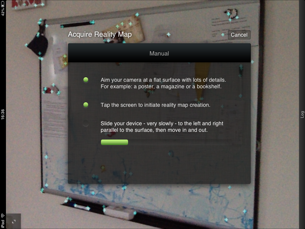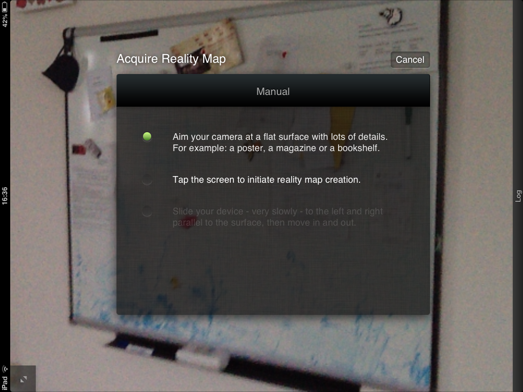 Once loaded, you can point your camera at a flat surface with some helpful detail (SLAM systems are presumably greatly helped by the existence of unique visual detail). I chose the whiteboard in our kitchen: