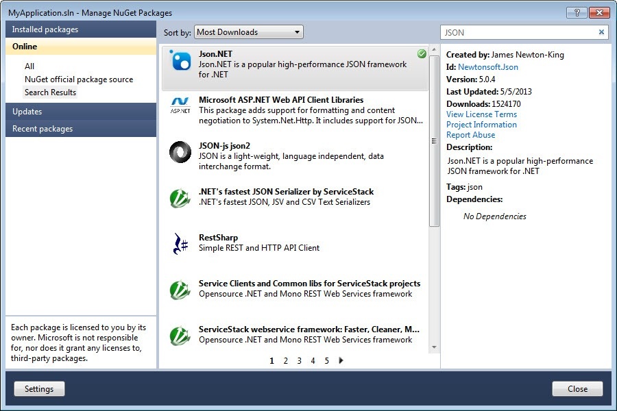 The simple way to add Json.NET to your project is via NuGet. In the Visual Studio interface select Tools –> Library Package Manager –> Manage NuGet Packages for Solution…