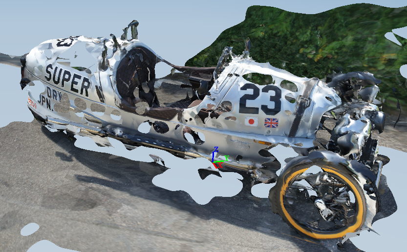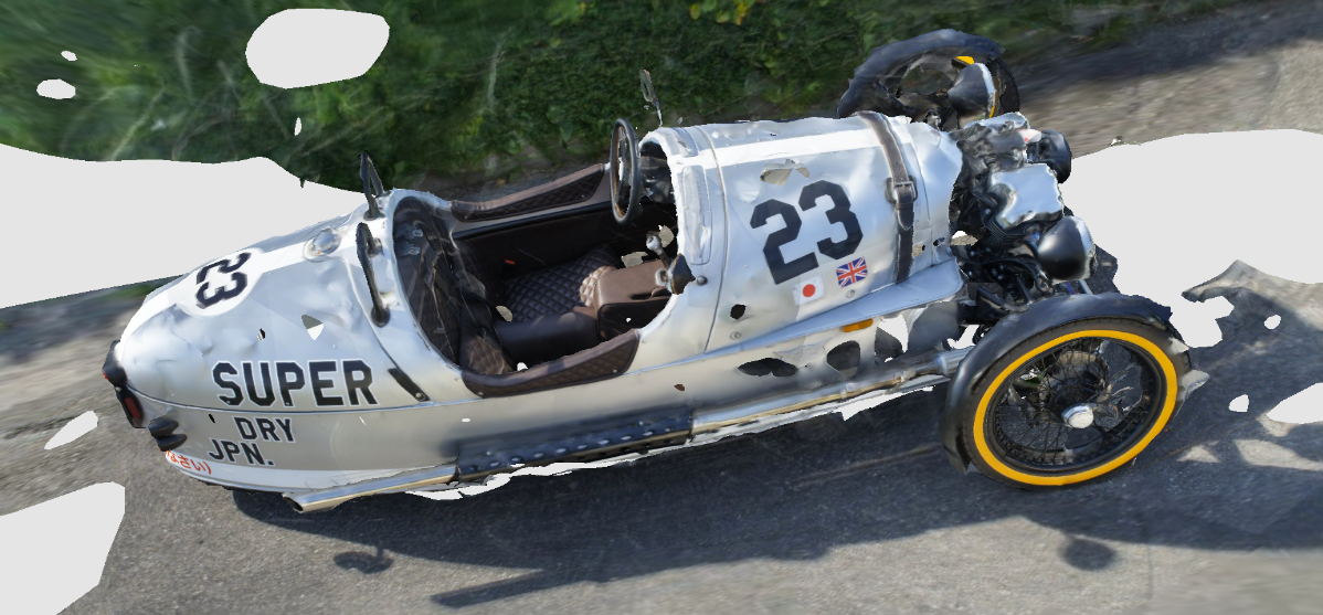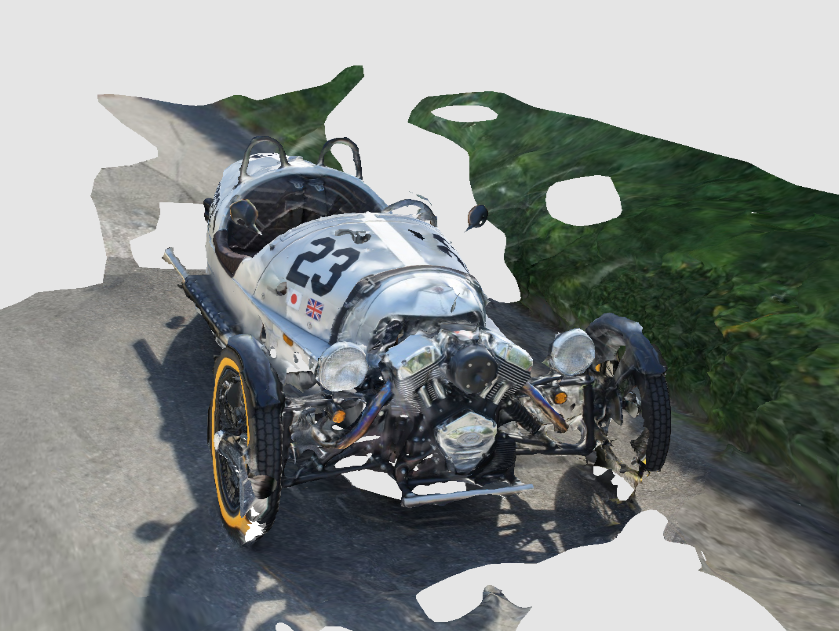I've talked before about Morgan Motors and their iconic Morgan 3 Wheeler. I've had the chance to snap a bunch (actually 75) pictures of the M3W Superdry Edition, and have uploaded the images via (the desktop version of) 123D Catch and into the currently-in-beta ReCap Photo. I used the stitching tools in each to manually stitch the photos that were not picked up automagically (which interestingly was a slightly different set on the two systems that both use the Photofly back-end service – presumably because ReCap Photo takes full resolution images rather than reduced resolution versions as 123D Catch does).