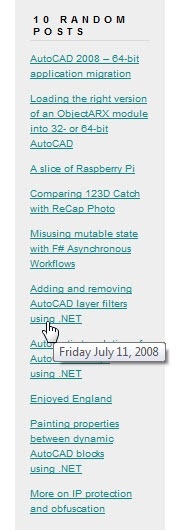 I've therefore added the "10 Random Posts" section in the right-sash, which picks out and displays a set of random posts from the blog's content archive every time a page is loaded. This was surprisingly tricky to implement using TypePad: I had to jump through some hoops to generate the information I needed for the various posts and ended up storing hard-coded information on the first 999 posts in the sash itself (anything from 1000 onwards gets added to this list dynamically, so future posts will also be included).
