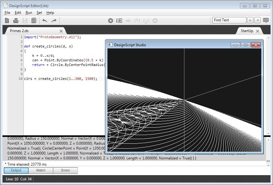 This particular script creates a huge number of circles. It's actually pretty fun to see the Lite viewer display the results progressively as the execution unfolds. While readers of this largely AutoCAD-focused blog will generally not be interested in running DesignScript in a standalone environment, there may well be the odd use-case for which you might find it useful.