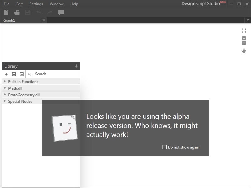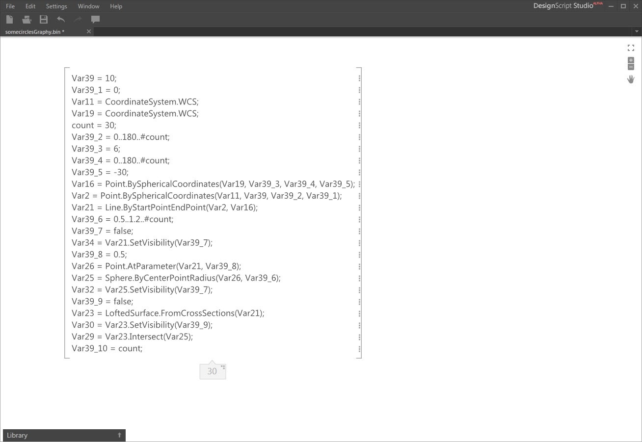 The eventual goal for DesignScript Studio is that you'll be able to generate graphical views of existing DesignScript files, so that's (of course) the first thing I tried. The tool (as you can see above ๐ had kindly warned me not to expect too much, and โ sure enough โ it turns out this piece is something that isn't yet working.