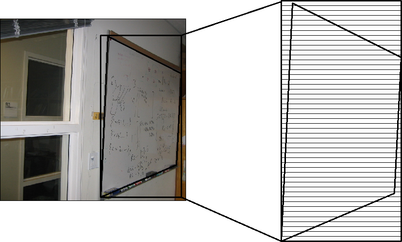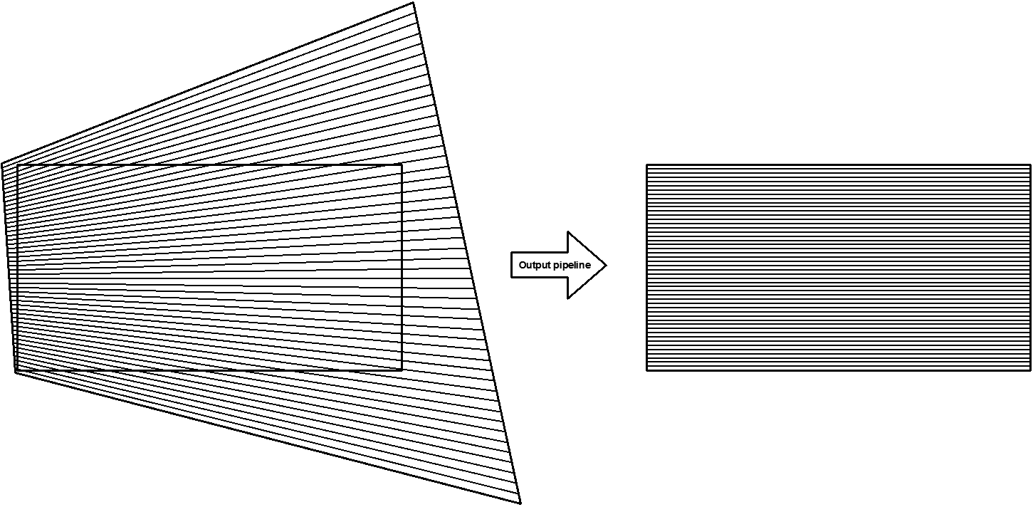 The "transform" pipeline then takes this – with a separate "task" for each row in the area of the input image that we care about – and transforms the pixel information into our target coordinate system (where the skewed area is rectangular):