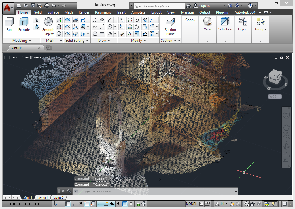 The first order of business was to integrate colour into the existing AutoCAD-Kinect samples. This didn't prove to be too tricky, overall: I chose the path of least resistance, to fork the existing Kinect Fusion command implementation, so there's currently quite a bit of duplicate code. At some point I'll factor out shared functions or add to the class hierarchy, but the first step was to get the commands working with as few differences as made sense. That's what I've included, for now.