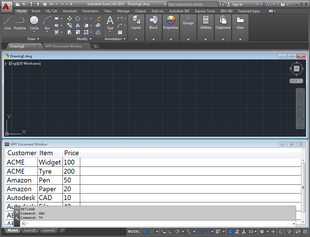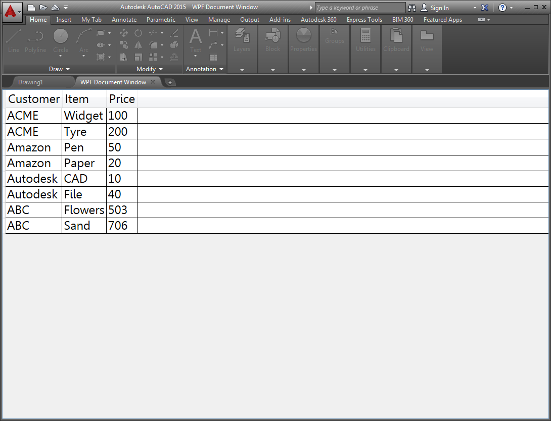 Just as with last week's post, there really isn't that much to it: you just need to add your own WPF UserControl to the project and load that into an Autodesk.AutoCAD.Windows.WPFDocumentWindow object and pass it to other version of the DocumentCollection.AddWindowDocument() method. So I went ahead and added a little code to load some hardcoded XML data into a DataGrid hosted by said UserControl. It's very basic – I haven't taken care of any real-world concerns in this sample – but then it's better than staring at a blank window. 🙂