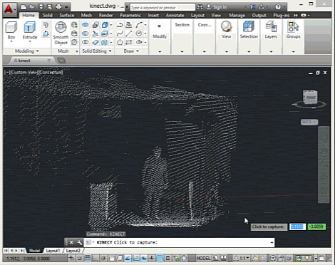 Capturing point clouds in AutoCAD can be achieved with the original KINECT command (along with variants such as KINBOUNDS and KINSNAPS, which enable clipping and timelapse capture, respectively).