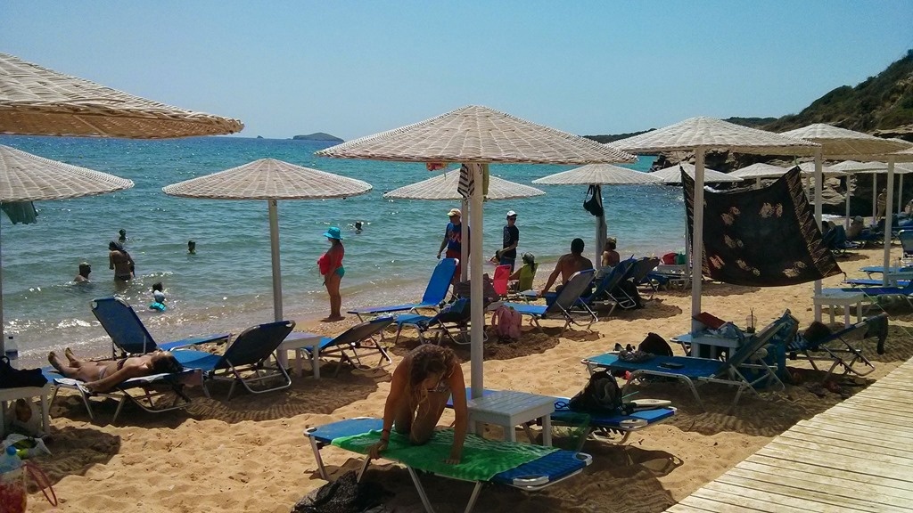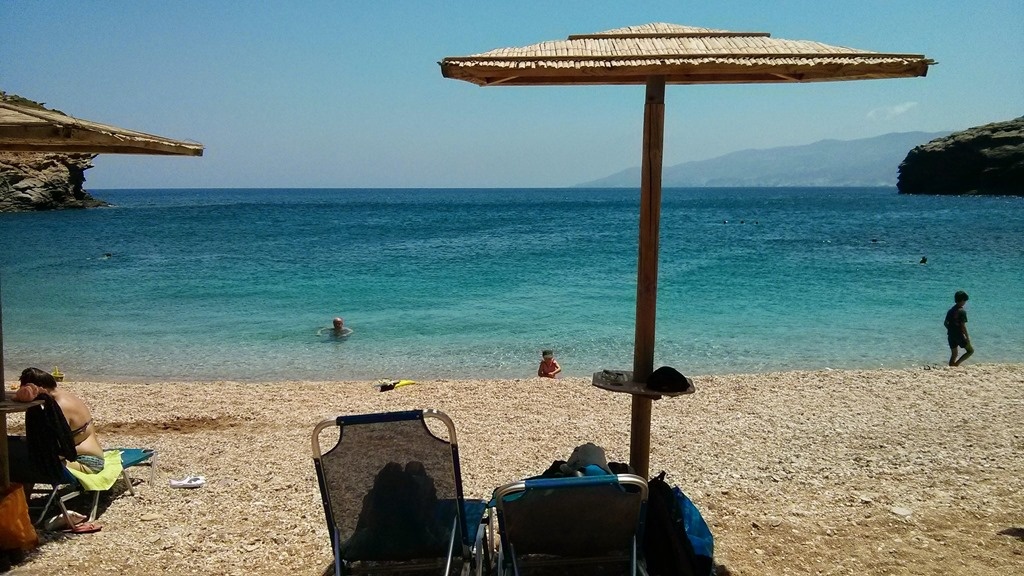 This was a fantastic beach, with a much more tolerable access road. Yes, it was still dirt, but it really wasn't so bad when compared with Achla. The restaurant was very good (even slightly cheaper than elsewhere) and having beach umbrellas at the end of the drive in was a nice bonus. (The price across Andros is a fairly uniform €3 per sunbed – in a few places with competition – such as Kypri and Agios Petros beach – you might find them at €2.50 or get a free bottle of water thrown in.)