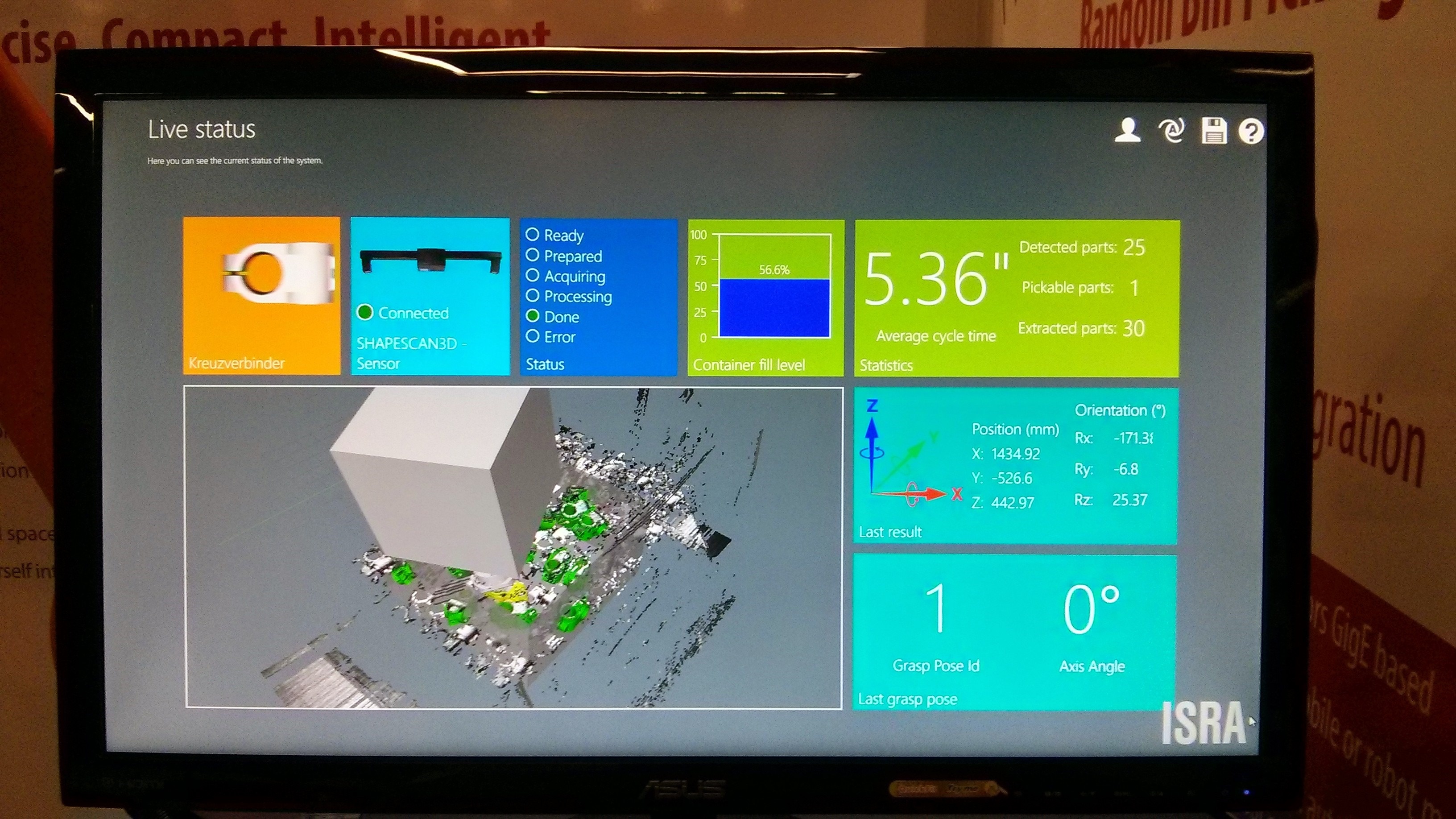 The system scans the top level of the bin and matches portions of the point cloud against a known 3D model of the part. That way the robot can effectively position itself to pick up the "best" part from the bin and then go ahead and do something with it.