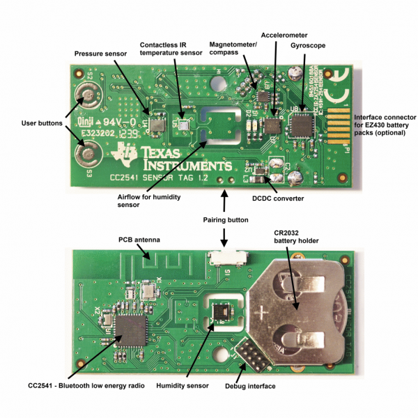 Here's an assembly diagram alongside a close-up of the SensorTag's internals, showing where each of the sensors resides: