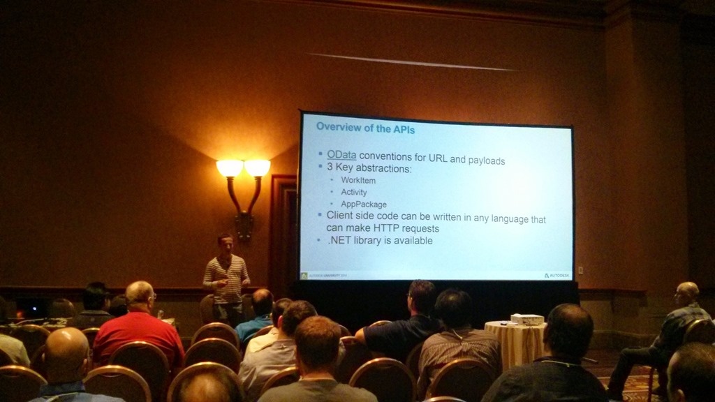 Wednesday was my busiest day, presentation-wise. In the morning I talked to a roomful of people interested in AutoCAD's JavaScript API and then to a smaller (but very engaged) crowd about connecting AutoCAD to SensorTag in the afternoon. The day's presentations ended with a panel session about Autodesk's Cloud and Mobile APIs, which was really interesting.