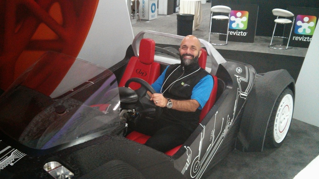 I snuck back into the Exhibit Hall when it was closed to have my photo taken sitting in the world's first 3D printed car.