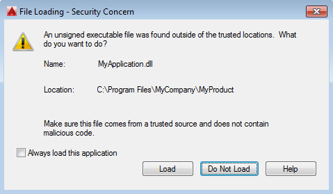 Firstly, the word "unsigned" indicates something very important: we're encouraging developers to sign their executables – and even their LISP files – to improve security. An increasing number of AutoCAD customers – often the larger ones, as you might expect – are requiring application modules to be signed. This is certainly a topic that's worth go into more deeply in a future post.