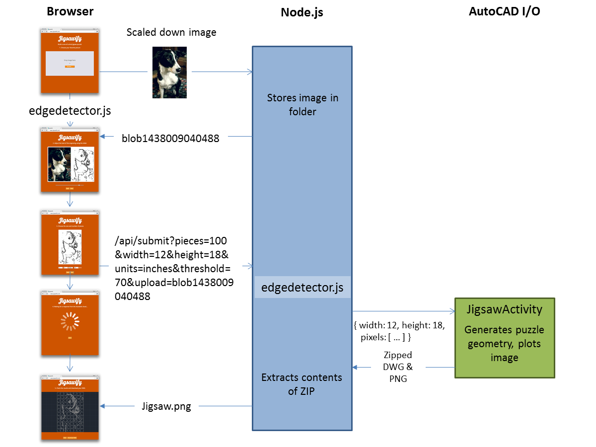 The intention of the site is that you upload an image and then see some edge detection get performed on it, generating an engraving layer for a custom jigsaw puzzle. AutoCAD I/O gets used to generate a drawing that can drive a laser cutter, creating your 100% unique jigsaw puzzle. Basically making the world a better place through the power of jigsaws. 😉