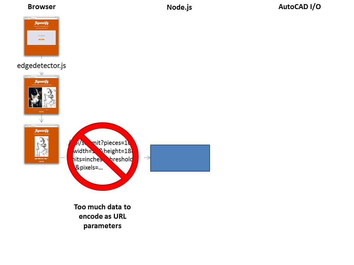 Back to the drawing board, then. My next design worked on the basis that – rather than relying on the heavy lifting being done in the browser – we could upload the selected image (or a scaled-down version of it) and run our edge detection code in a custom web-service. We launch the upload in the background as soon as the image is selected, so the user should see no lag, from their side. When the user has selected the various options in the browser, the Node.js service gets called again – where our edge detection algorithm gets run, server-side – and will in turn call into AutoCAD I/O for the geometry generation.