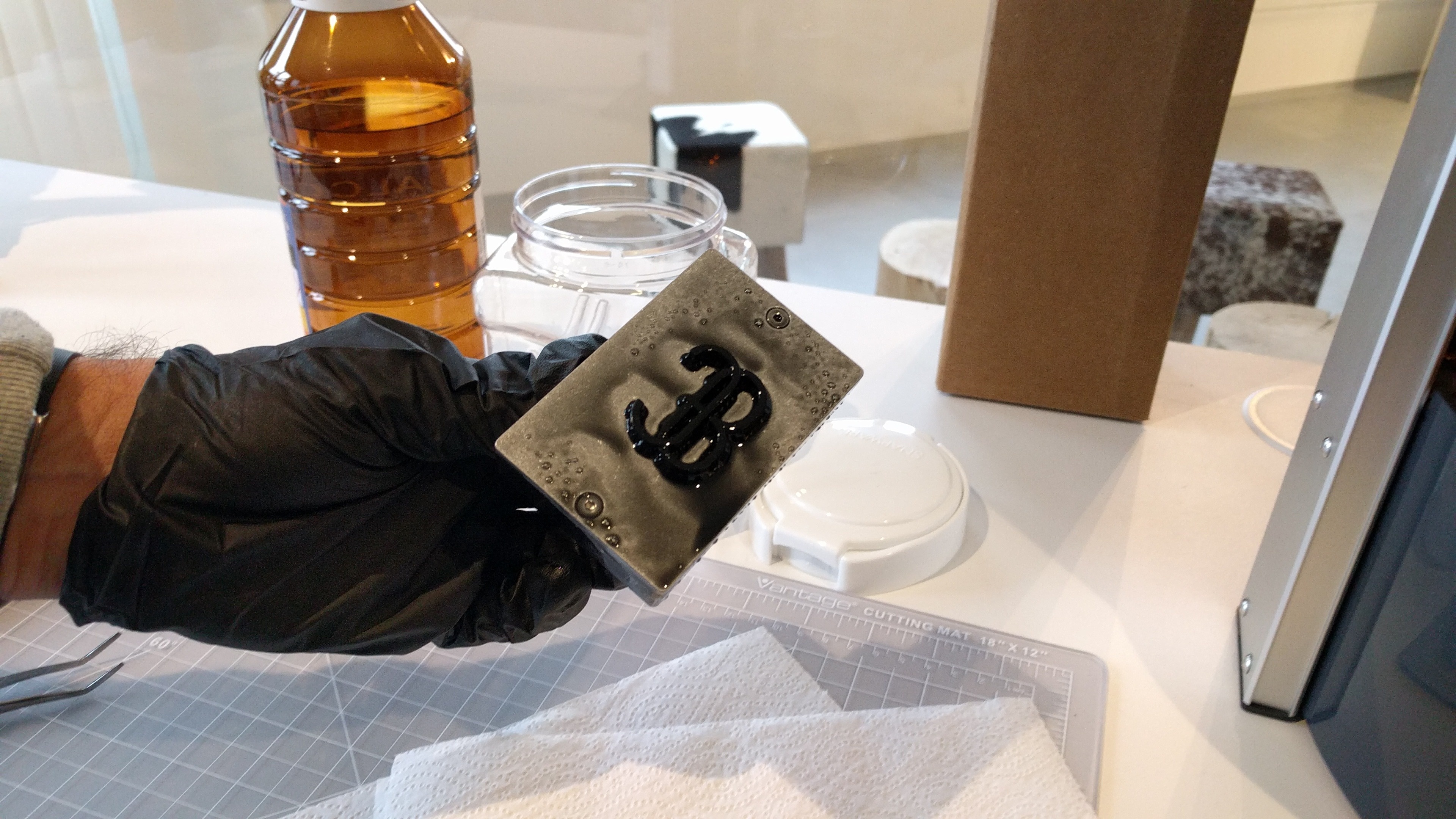 Fernando sensibly donned gloves to remove the print. We were both quite excited to see how it came out… one thing about printing in black resin: you don't know it's working until the very end!