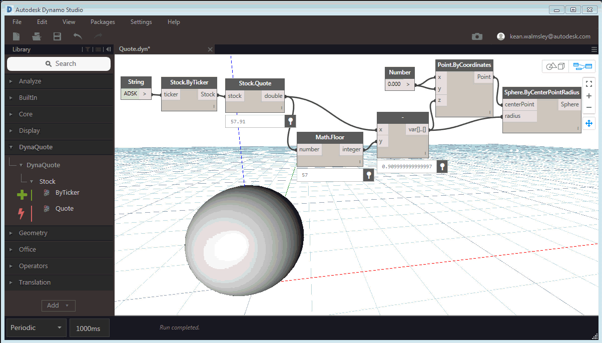 I used a couple of tricks to make it all more visible: firstly I took away the integer component of the stock price (as 2 cent fluctuations on a base of $58 aren't very visible), before using that for the sphere's radius. I also edited out big chunks of the video, as stock-watching is boring business. I tried having the colour of the sphere keyed off the stock price, too – which would make this very much like a virtual version of Ambient Devices' Stock Orb, a ground-breaking device that's incredibly been around for 14 or so years – but as I'm running Dynamo Studio in a virtual machine, and the Display.ByGeometryColor node apparently uses hardware rendering, this didn't actually do anything beyond adding unwanted complexity to the graph.