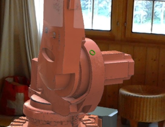 Here's the gaze cursor on our robot. To make it more visible than the red one in the tutorial, I changed its colour to green. It's cool to see how nicely (and responsively) it hugs even complex geometry in our model.