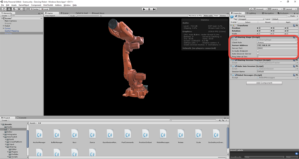 I've been starting to work on extending the "Dancing Robot" HoloLens project to have a shared hologram: basically to have the position changes shared between devices, as well as the angles and speeds of the various parts of the robot arm.