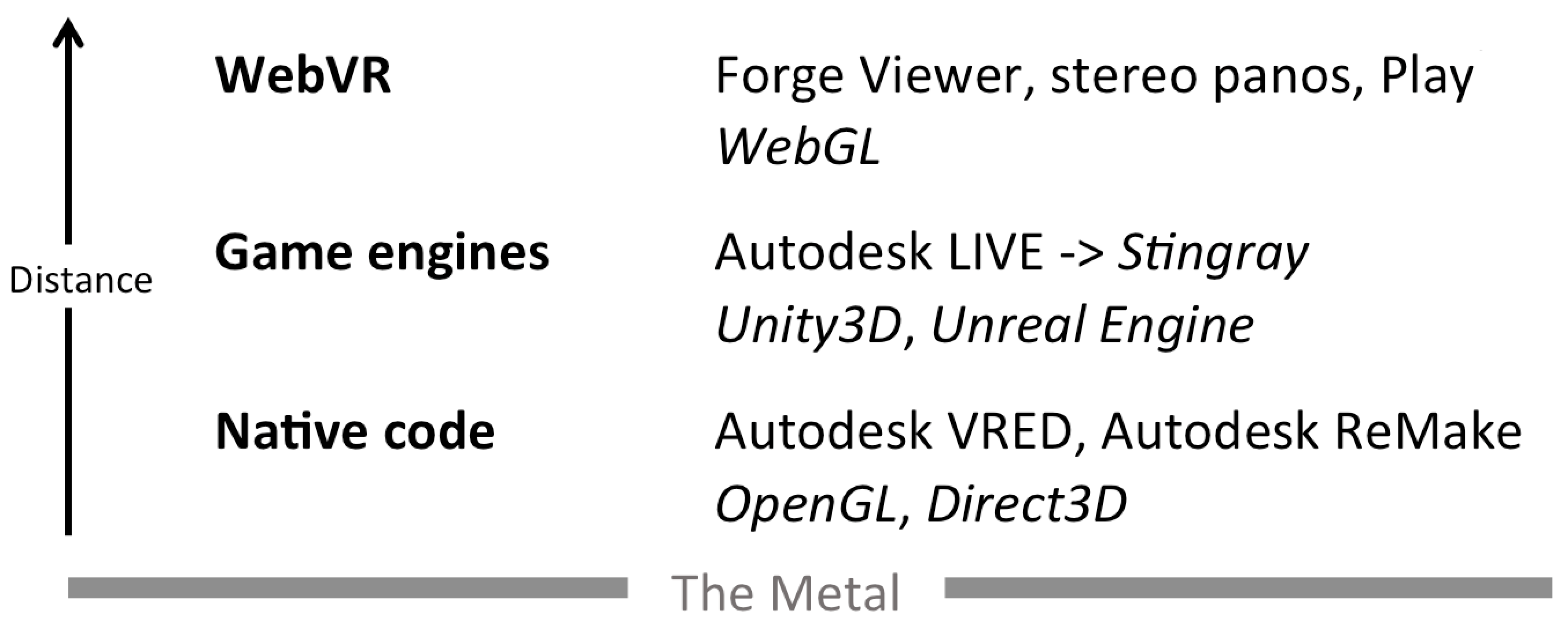 At the top level we have WebVR. This refers specifically to the cross-browser initiative to using WebGL to deliver VR on the web. I've put this furthest from the metal, for now, as it sets the appropriate performance expectations for where we are today: in truth WebGL is calling through pretty efficiently into graphics hardware, and as browsers' execution environment gets optimised over time – for instance as we start to see the benefits of WebAssembly – we could well see this getting closer to the performance profile we see for game engines. We'll see.