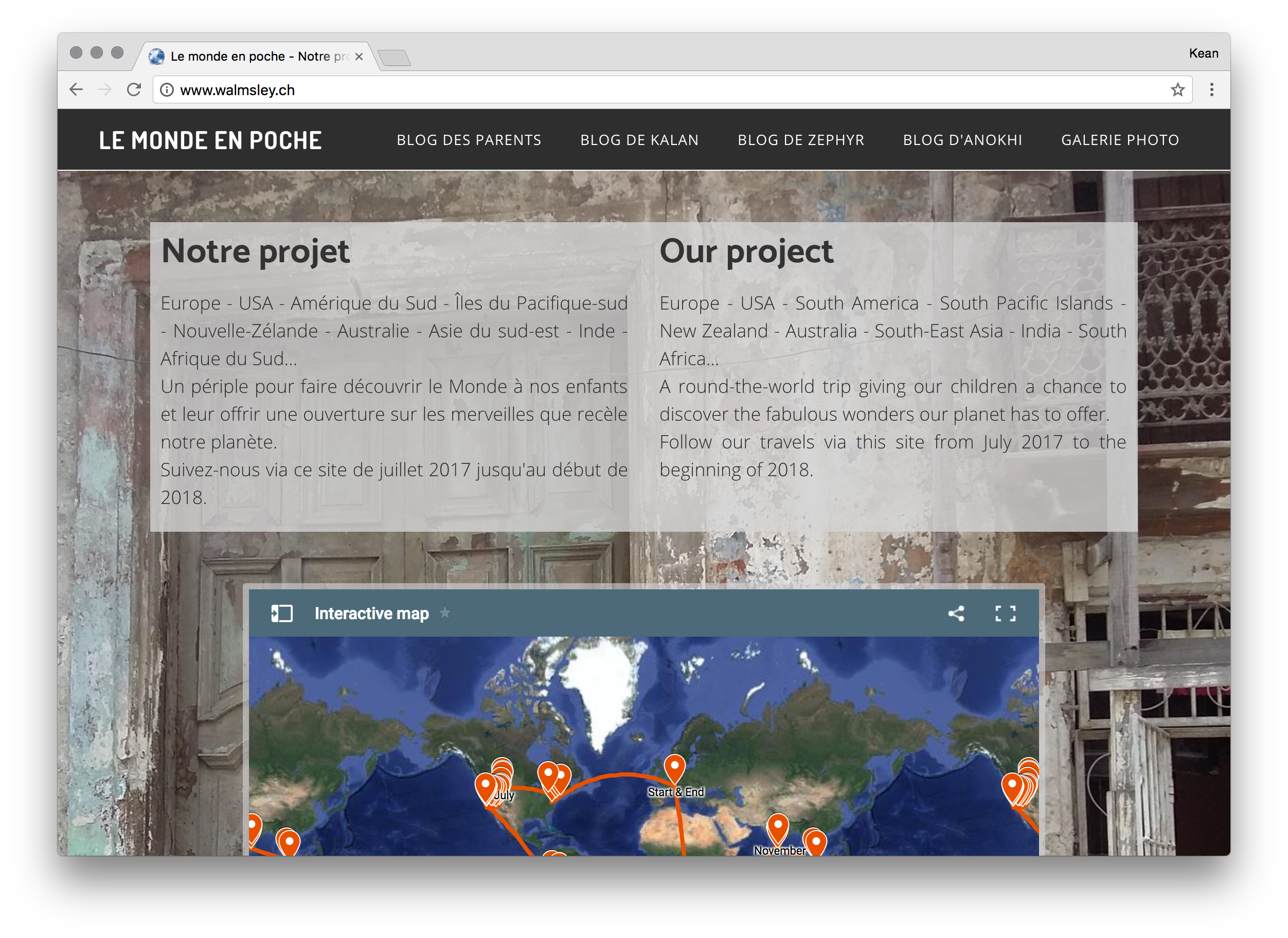 Celia does quite a bit of web design and social media work for local organisations, and so decided to set up a website for our trip. I've had a domain gathering dust for perhaps a decade, now, so the site is now live at walmsley.ch. She has called it "le Monde en poche", literally "the world in your pocket" (the best idiomatic translation is probably "the world is your oyster").