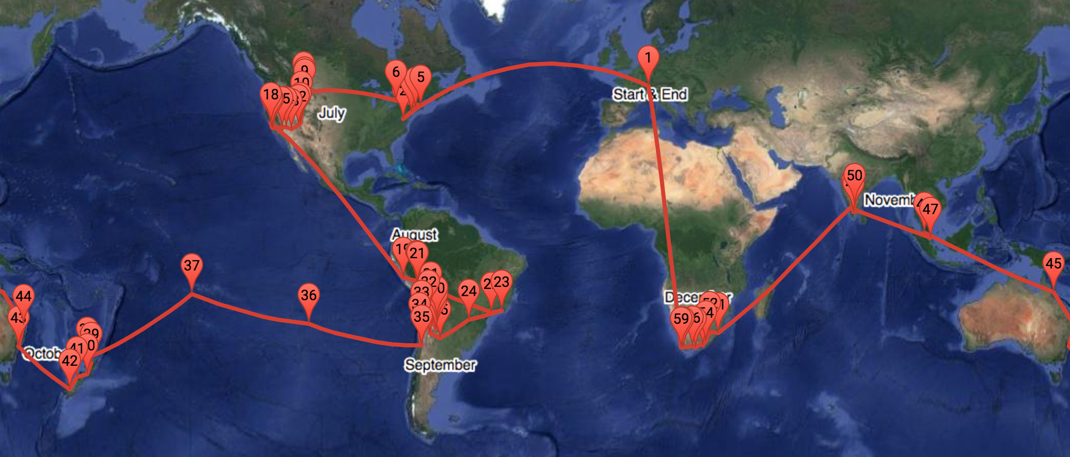Round-the-world itinerary with map labels